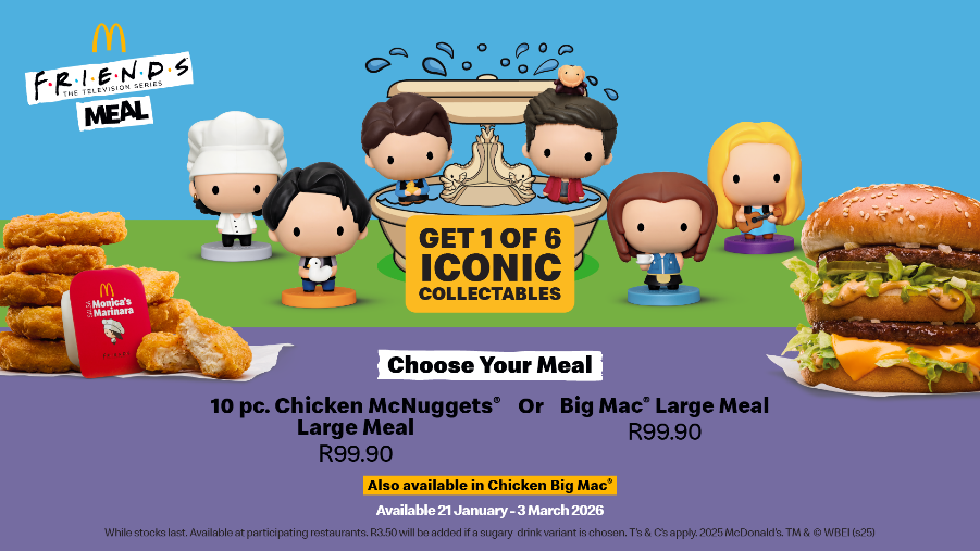 “At McDonald’s, we’ve always believed in the power of shared moments, and what better way to celebrate that than with FRIENDS,” said Daniel Padiachy, Chief Marketing Officer at McDonald’s South Africa. “This partnership brings together two cultural icons that stand for connection, comfort, and joy. The FRIENDS-inspired meal creates a fun and nostalgic way for fans to come together – whether it’s over fries or catching up with friends – and feels perfectly at home in South Africa today.”